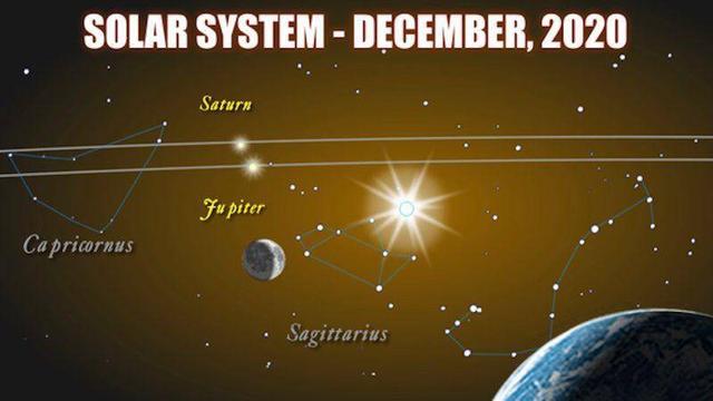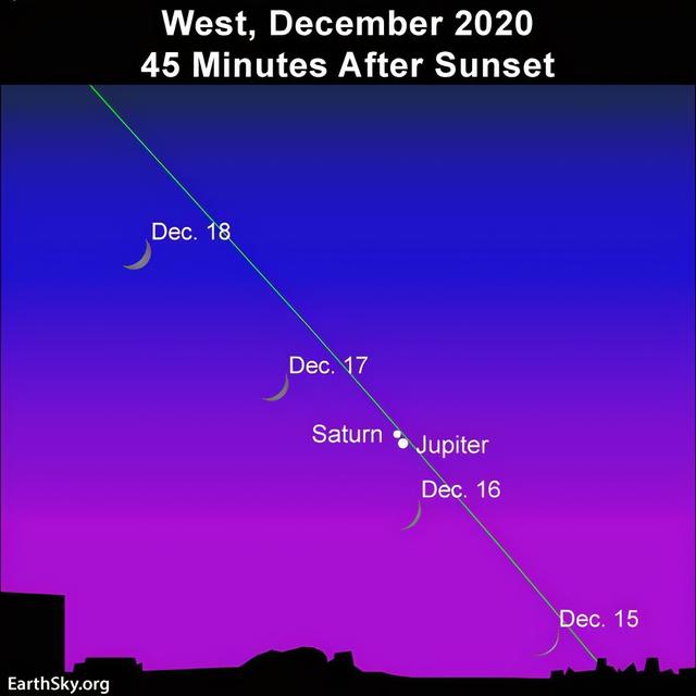 12月,在木星和土星接近他们相距最近之时,新月将掠过它们。从2020年12月16日至25日,在月球接近之时这两颗行星之间的距离将少于满月直径。不要错过这个日落之后西方天空中的绮丽景象!木星更将明亮,它的亮度是土星的12倍。土星也相当明亮,亮度相当于一颗一等星。