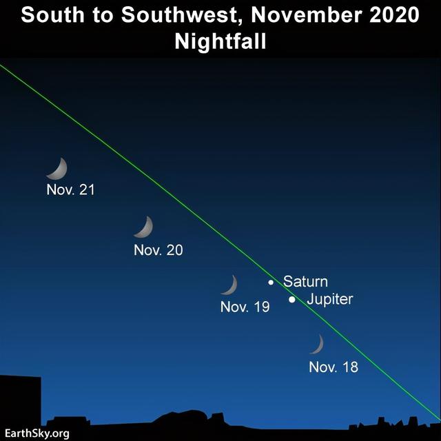 在最近的几个夜晚,月亮一直在木星和土星附近摇摆,而且一直到2020年11月20日和21日也是如此。