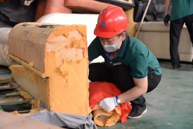 进入厂房,工作人员正在“大件分解区”内对沙发、床板、柜子等大件垃圾进行初步分拣,将木头、泡沫、皮革等不同材料分开。
