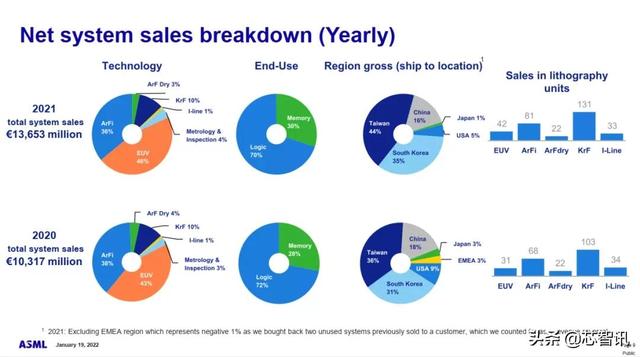 从销售的光刻系统的最终用途来看,70%被用于逻辑半导体制程,30%被用于存储芯片的制造。