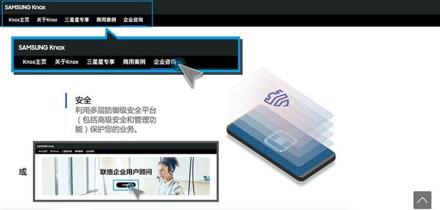 点击页面中“SAMSUNG Knox”了解移动商用解决方案相关内容