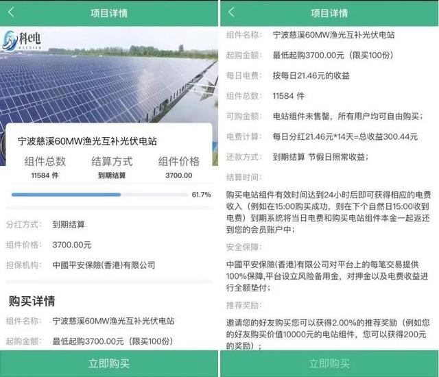 以“宁波慈溪60MW渔光互补光伏电站”为例,项目详情显示,最低起购3700元(限买100份),每日收益21.46元,项目组件总数11584件,结算方式为到期还本还息,且节假日照常收益,项目的投资周期为14天。可购金额这一项显示“电站组件未售罄,所有用户均可自由购买”。