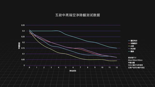 其中净化效率最快的是这条黄色的线,也就是必胜,6分钟的时间降到了国标0.08以下。霍尼韦尔、布鲁雅尔、科沃斯这三款的净化效率比较接近,降到国标之下都花费了10分钟左右。最后是戴森,前5分钟几乎没有动静。还是那句话,作为一台风扇,太难为它了。