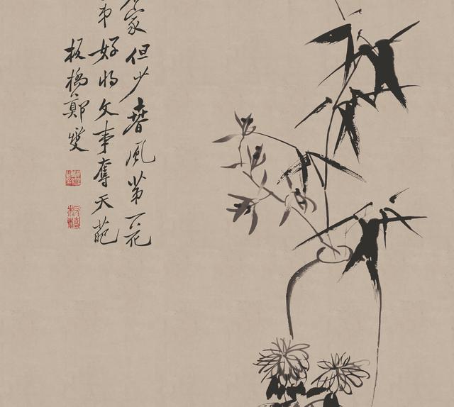 画中绘有绘竹、兰、菊三君子,全图皆水墨勾勒,竹子的笔直修长,兰的清新秀美,菊的严霜开放,尽显君子谦谦之态。画中同样能够欣赏郑板桥书法,用隶体掺入行楷,自称“六分半书”,人称“板桥体”,在中国书法史上更是独树一帜。