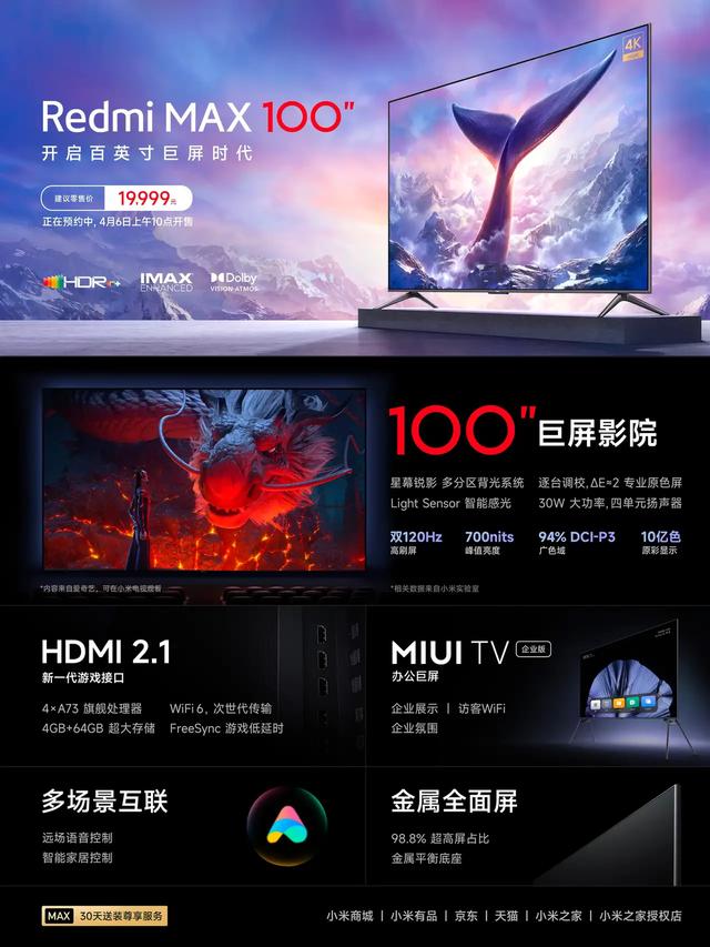 售价上,红米MAX 100英寸售价为19999元,只要不是单纯的不喜欢红米这个品牌,这款产品就可以闭着眼买。