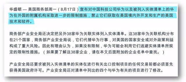 8月17日美国商务部宣布对华为以及被列入实体清单上的华为在境外的附属机构采取进一步的限制措施,禁止他们获取在美国境外开发和生产的美国的技术和软件,换句话说华为用别人的芯片的这条路暂时也被堵死了。
