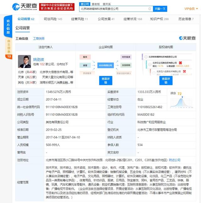 北京转转精神科技有限责任公司成立于2017年4月,注册资本约1350万人民币,公司经营范围包括委托生产电子产品、照相器材、计算机、软件及辅助设备,从事互联网文化活动,出版物零售等,法定代表人为58同城CEO姚劲波。天眼查股权结构显示,转转的最大股东为北京云企互联投资有限公司,持股74.10%,后者为北京五八信息技术有限公司的全资子公司。转转的第二大股东为腾讯投资的投资实体之一林芝利创信息技术有限公司,持股24.70%。