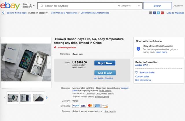 [PConline 资讯]荣耀Play4 Pro测温版在海外市场意外火了。据外媒news affinity报道,荣耀Play4 Pro测温版在eBay转卖价格高达999美元,与iPhone 11 Pro相同。