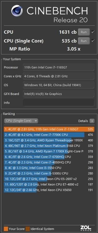 我们以CINEBENCH R15/R20的单核和多核性能为参照,这颗处理器在R15标准测试中单核得分220cb,多核得分751cb;R20标准测试中单核得分535cb,多核得分1631cb。由此可见,第11代英特尔®酷睿™处理器在大幅强化主频、睿频能力之后,其单核和多核性能有了大幅度提升,满足日常文档、电子表格、PPT、图片处理、编写代码等办公应用没有任何问题,同时还可兼顾一些轻量级的视频剪辑或渲染应用。