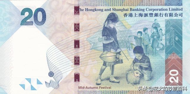 20港元主题是中秋节,主图为中秋灯节上嬉戏玩耍的儿童,背衬鲤鱼灯笼意喻年年有余,印有“中秋”字样。中秋节,有许多的游戏活动,首先是玩花灯。中秋是我国三大灯节之一,过节要玩灯。画面上的小朋友有兔子灯、鲤鱼灯、孔雀灯,还有杨桃灯。