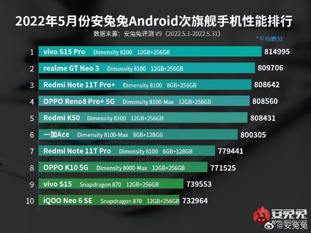 最疯狂的是次旗舰性能排行榜,进入 前十的机型排名前八的全部是基于联发科天玑8100平台打造的,只有后两位是基于高通骁龙870平台打造的。这种场景在安兔兔性能榜上还是首次出现,最难受的当然是高通了。因为在这个档次联发科的处理器不仅整体表现更突出,而且还有性价比的优势。可以讲在这个档次高通真没有能怼得上的处理器,当大家都采用天玑8000系列处理器时,自然高通的骁龙700系列处理器就要丢失大部分的市场。