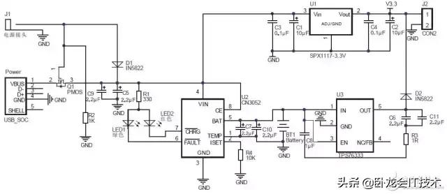 只有电源适配器供电,PMOS 管截止,输入电压经D1 降压后,给后级电路供电,D1 采用肖特基二极管,导通压降约为0.3V ;只有USB 供电,PMOS 管导通,D1 用于防止USB 接口通过电阻R2 消耗电能;两者同时存在,PMOS 管截止,电源适配器输入电压经D1 降压后,给后级电路供电。