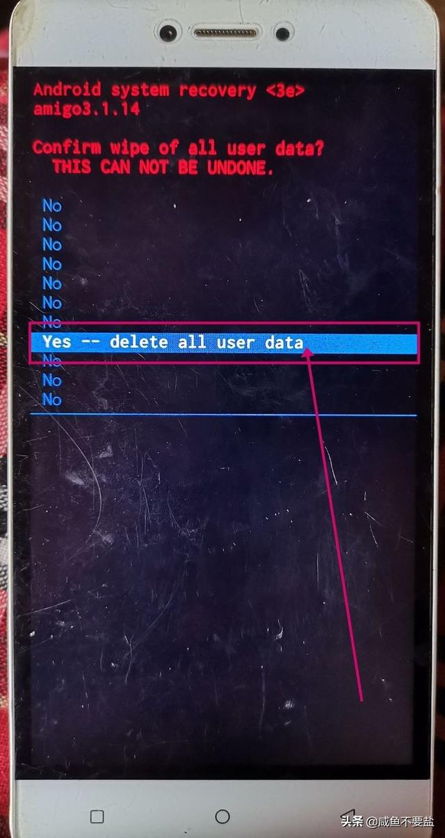 步骤5.使用“音量键”将光标调整至“Yes--delete all user data”,然后按一下“电源键”确认。