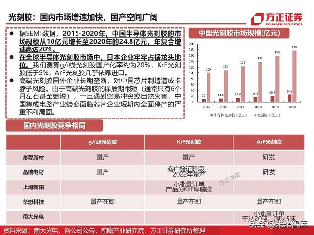 KrF、ArF为主流:根据美国半导体产业协会SIA数据,2018年高端ArF干式和浸没式光刻胶共占42%的市场份额 ,KrF光刻胶和 g 线/i 线光刻胶各占 22%和 24%的市场份额。目前,ArF光刻胶已成为集成 电路制造领域需求量最大的光刻胶产品,随着未来集成电路产业的进一步发展,ArF和KrF光 刻胶面临广阔的市场机遇。