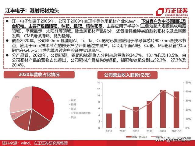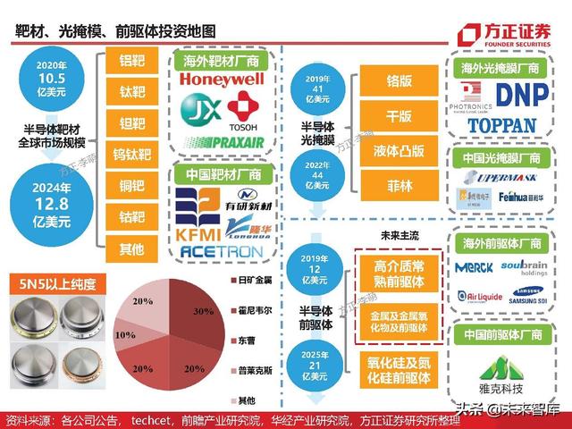 依据2020年全球半导体制造材料349亿美元规模和靶材3%左右占比计算,2020年全球靶材市 场规模10.5亿美元左右。根据techcet数据,2020-2024年全球靶材市场年复合增速5%,预 计2024年全球溅射靶材市场12.8亿美元左右。