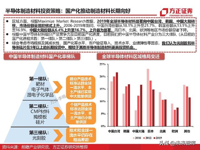 我们认为,在中期维度方面,封装材料基于更高的国产化率,能够更早地实现国产替代。同时,国 内封测全球领先,定增扩产明显,下游驱动更为直接。在长期维度方面,半导体制造材料相较于封 装材料拥有更高的壁垒和国产化潜力,所以制造材料的长期成长空间更大。