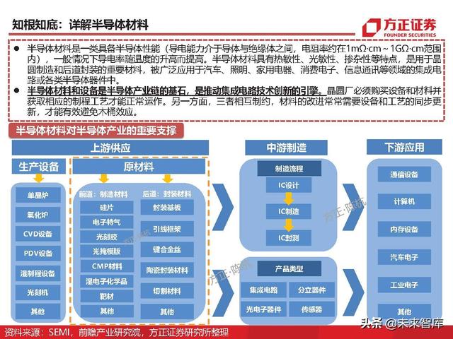 半导体材料是一类具备半导体性能(导电能力介于导体与绝缘体之间,电阻率约在1mΩ·cm~1GΩ·cm范围 内),一般情况下导电率随温度的升高而提高。半导体材料具有热敏性、光敏性、掺杂性等特点,是用于晶 圆制造和后道封装的重要材料,被广泛应用于汽车、照明、家用电器、消费电子、信息通讯等领域的集成电 路或各类半导体器件中。