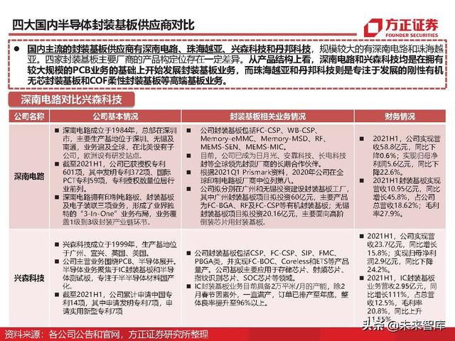 根据Prismark数据,2020年全球封装基板产值为101.9亿美元,同比增长25.2%,未来5年封装基板的年 复合增速为9.7%,并于2025年实现161.9亿美元的产值。深南电路是规模最大的内资封装基板企业, 2020年其封装基板业务实现销售收入为15.44亿元,同比增长32.67%,但仅占全球封装基板的2.94%。