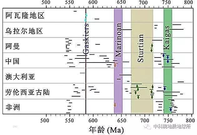 不同地区与Gaskiers冰期有关的碳同位素负漂移的地层和有关年龄分布图
