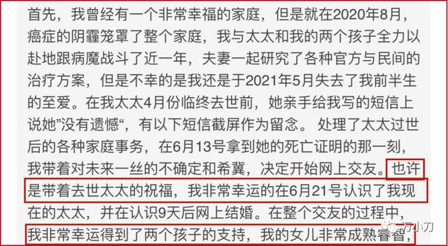 9天后的6月21日,心急的男一号很快就吃到了热豆腐,他说,“带着去世太太的祝福”,他认识了现任太太,也就是女二号!