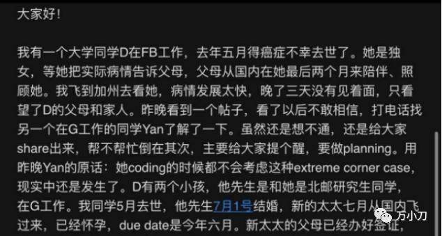 女一号:网上爆料里所说的D,北邮研究生毕业,男一号亡妻,硅谷脸书员工,年薪约20万美元,于2020年患癌,于2021年5月在美国去世。配角的独生女儿。