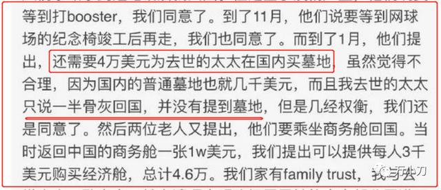 谁知,男一号竟然严词拒绝了,只同意为二老提供每人价值3000美元的经济舱,再加上买墓地的钱,共计4.6万美元。