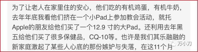 更可笑的是,在文章中,男一号继续替自己美言,称岳父母在美国期间,他给二老买有机牛奶、有机鸡蛋、平板电脑以及保健品,以此来表明自己的孝顺。