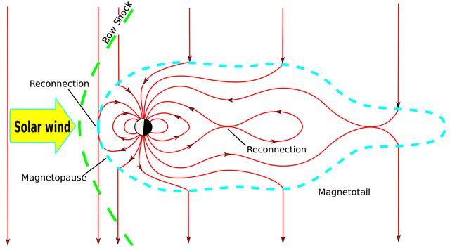 磁暴(通常称为太阳风暴)是由太阳风冲击波与地球磁场相互作用的磁场云引起的地球磁气圈的临时扰动。