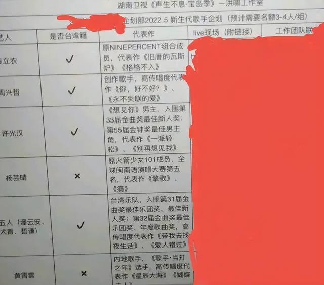 而在近日,有博主再次爆料出《声生不息·宝岛季》拟邀新生代名单,总共有六组,其中台湾籍艺人四组,他们分别是陈立农、周兴哲、许光汉和告五人;内地歌手为黄霄云以及外国籍杨芸晴。