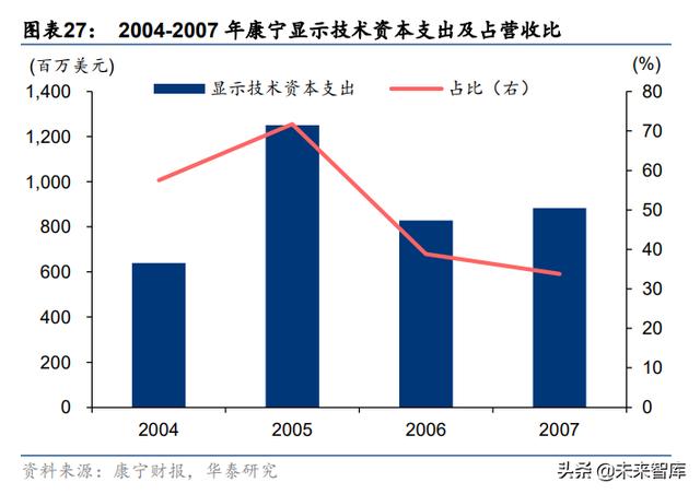 积极转型,顺应时代潮流。康宁以玻璃制造起家,于 1964 年发明溢流熔融法技术,1982 年推出高强度 LCD 玻璃基板,事实上 1997-2002 年间光通信业务一直是康宁的主要收入来源。随着液晶显示器的普及拉开序幕,康宁积极开展转型,加大对显示玻璃基板业务的布局。2004-2007 年,康宁一直维持着高水平的资本开支,基本每年都有新增产能投资计划。逐年扩张的产能迎合了同样飞速增长的显示面板需求,2002-2007 年康宁公司的显示技术业务收入由 4.05 亿美元增长至 26.13 亿美元,期间 CAGR 高达 45%,收入在公司总营收中占比也从 13%提升至了 45%。