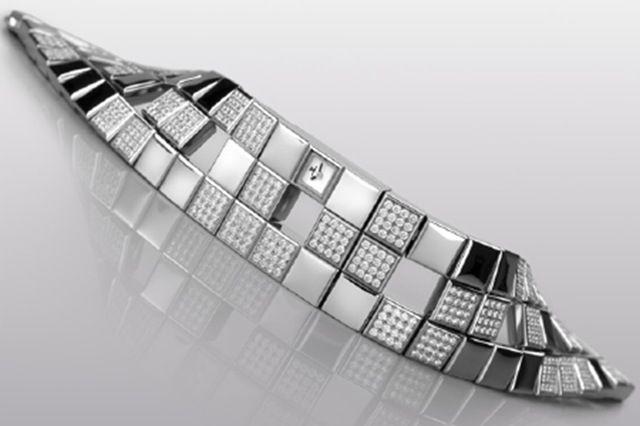 它被记录在记录簿中,是具有最小机械机芯的手表,由98个微小部件组成,每个部件重约1克。它拥有576颗钻石和蓝宝石表盘。一看手表,你会认为它实际上是一个手镯。表背有一个上链表冠,指针看起来像一片黑色的叶子。手镯上的那些方形物品实际上是重达18克拉的白金。