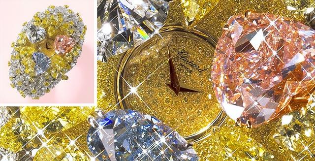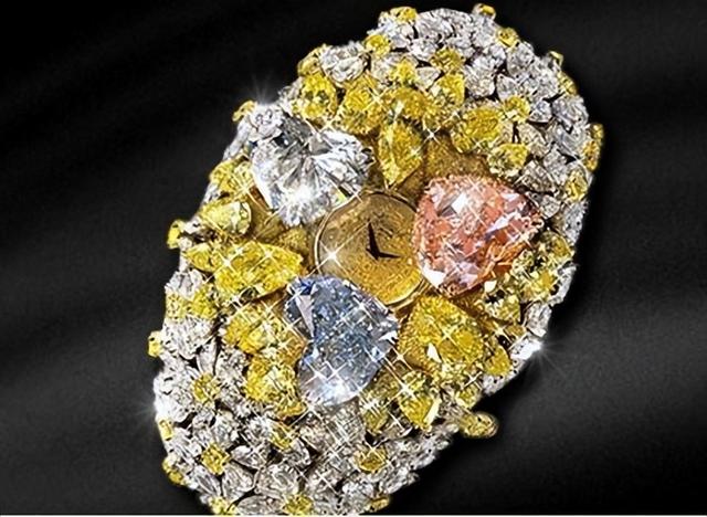 腕表镶嵌一簇五颜六色的钻石,包括一颗15克拉的粉钻、一颗12克拉的蓝钻和一颗11克拉的白钻。如果这还不够,那么也许另外163克拉的白色和黄色钻石就可以了!