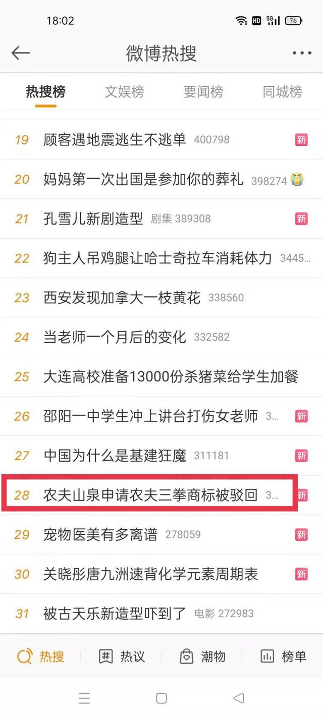 曾因“农夫山泉有点甜”广告风靡中华大地的农夫山泉今日上了热搜,原因是其申请“农夫三拳”商标被驳回。记者留意到,对农夫山泉此番“挫折”,网友有莫名喜感:“这是什么谐音梗?”“农夫山泉有点疼……”