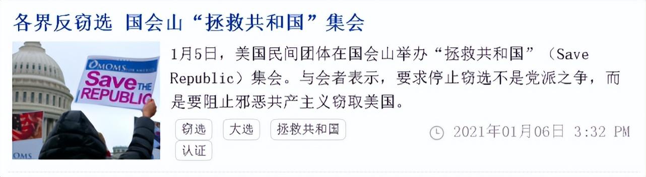 (截图为邪教“法X功”的喉舌网站“大X元时报”在为2021年的国会山暴乱“洗地”)