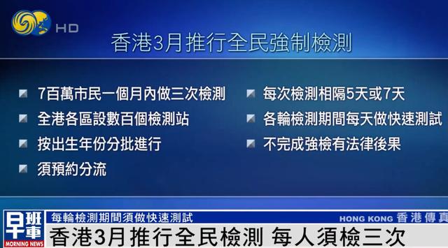 新冠疫情严峻,香港特区行政长官林郑月娥,22日宣布,将于3月推行"全民强制检测",市民须在指定时间内分批接受三次核酸检测,期间无须全民禁足,而不接受检测会有法律后果。为了配合全民检测,全港幼儿园及中小学提前放暑假。林郑月娥还表示,采样之后,如果香港没有足够的实验室化验要送去内地,但这个并不涉及私隐问题。
