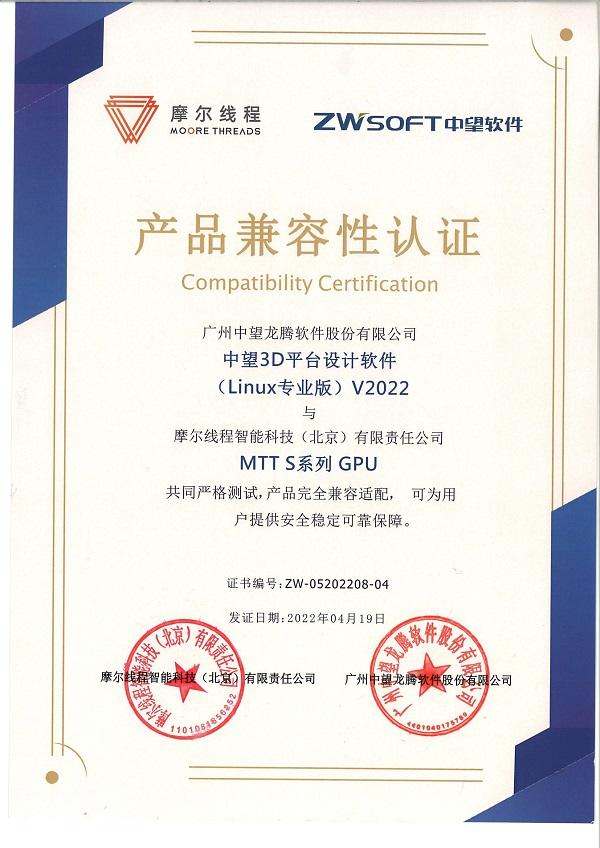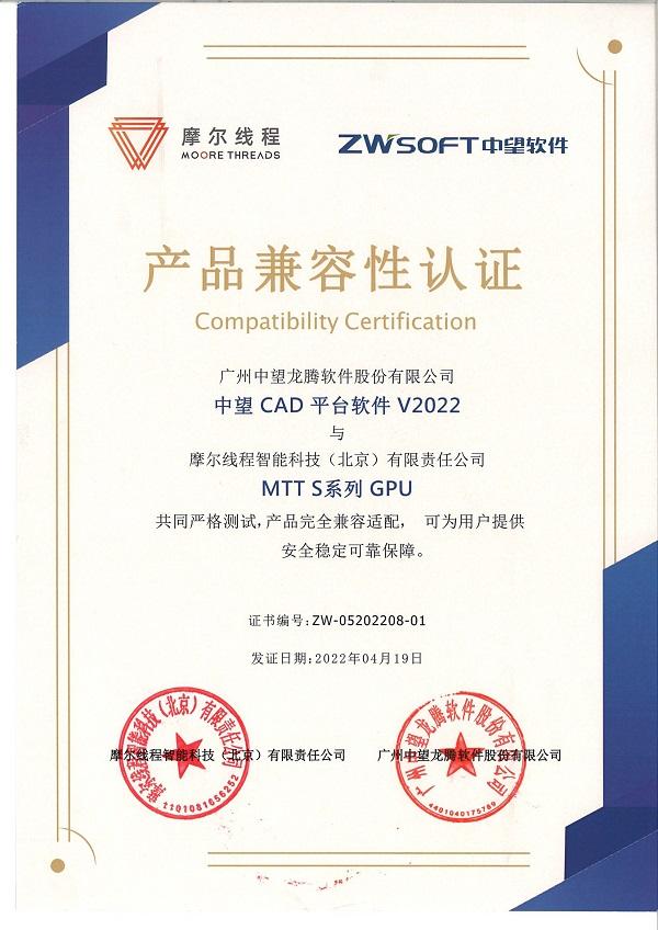 中望CAD 2022与MTT S系列GPU兼容性认证证书