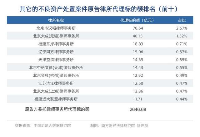 以其他为原告起诉处置并且超过一亿元的不良资产处置中,代理原告方的律师事务所标的额共计1282.64亿元,排名如下(前十)。其中,关于代理标的额,排在第一的是北京市汉韬律师事务所,为68.97亿元。其次是北京大成(无锡)律师事务所,代理标的额为37.80亿元。第三是福建东岸律师事务所,为18.65亿元。