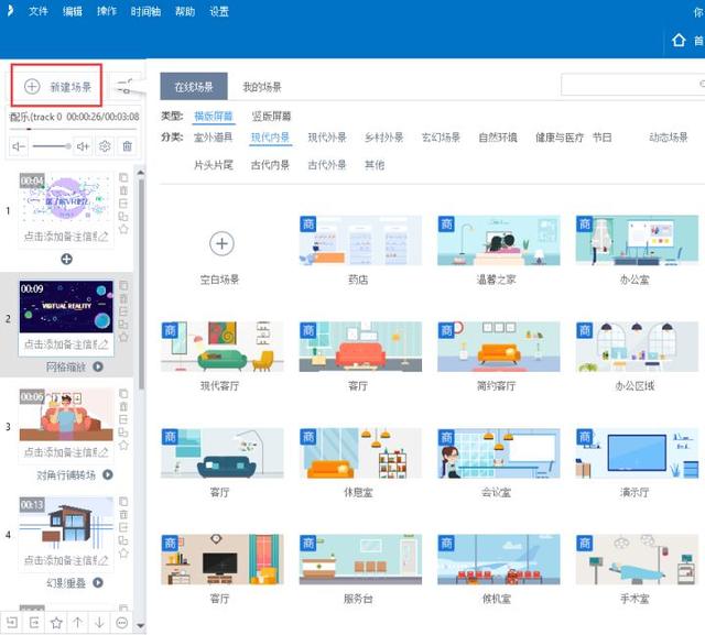 万彩动画大师提供多种类型的场景,每种分类下还包含大量的场景模板。在场景中添加可文字、图片等元素,并设置各种动画效果。