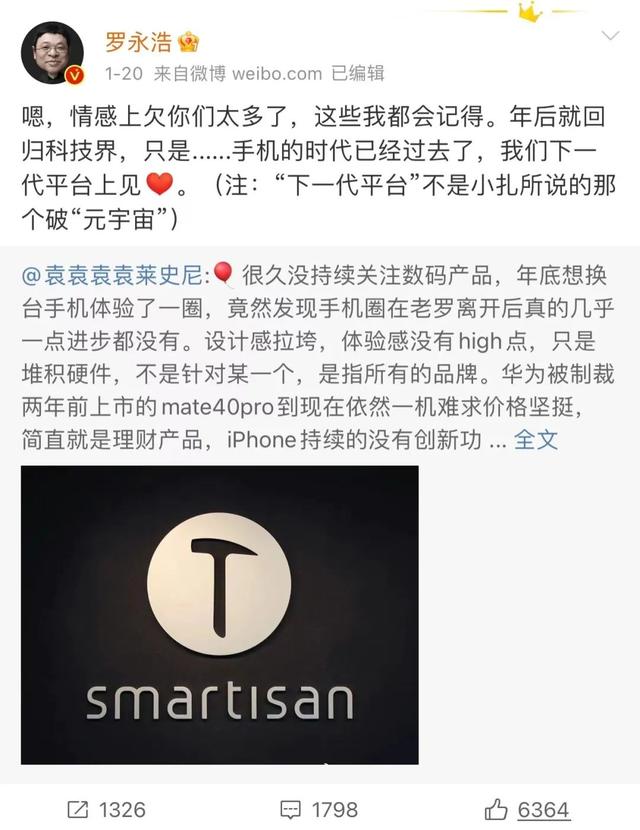 2022年1月20日凌晨,罗永浩在微博上转发网友评论,预告自己年后将回归科技界并强调,手机的时代已经过去了,下一代平台见,而“下一代平台”并不是扎克伯格所说的破“元宇宙”。