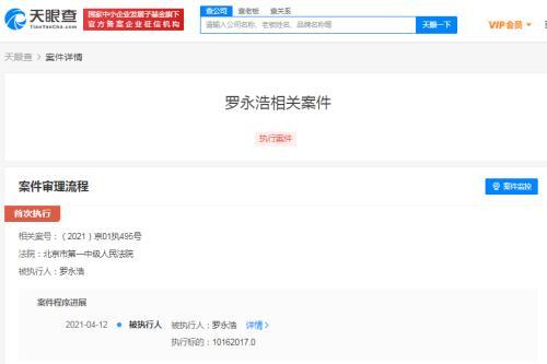 4月14日,天眼查显示,罗永浩近期又新增一条被执行人信息,执行标的1016.2万元,执行法院为北京市第一中级人民法院。