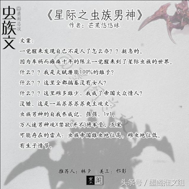 一觉醒来发现自己不是人了怎么办??挺急的。因为车祸而瘫痪十年的陈立一觉醒来到了星际虫族的世界。什么??我是天赋潜能100%的雄子?什么??这里全都搞基没有女人?什么??这里雌多雄少,我成了帝国大众情人?没错,这是一篇苏苏苏苏爽主攻文。虫族男神的自我养成记,强强,1v1。万人迷男神攻X禁欲(并不)将军受,互宠可能存在的雷点:虫族帝国雄虫地位高,雌虫地位低。有生子情节。