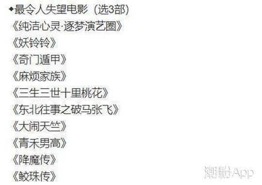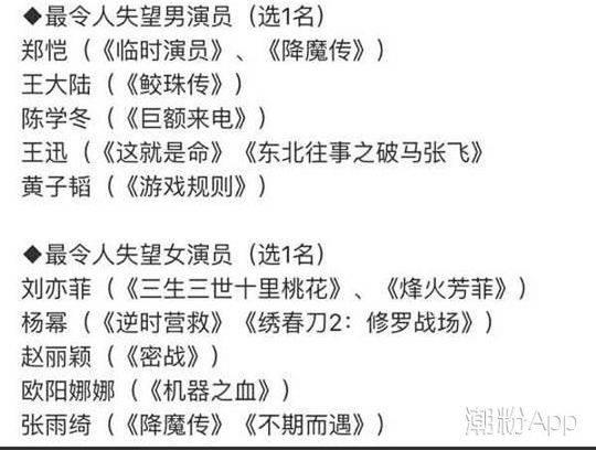 本届金扫帚奖“最令人失望女演员”,花落在《三生三世十里桃花》与《烽火芳菲》中有“出色”变现的刘亦菲身上,“最令人失望男演员”则被郑恺摘得。