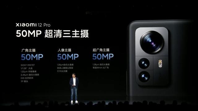 这次小米 12 Pro 选择了 5000 万三主摄配置,从上自下分别是广角、人像镜头和超广角。小米为了拿下更强的夜景表现,给最瞩目的那枚广角镜头用上了索尼最新一代旗舰 CMOS IMX 707,全球首发,拥有 1/1.28” 超大感光尺寸,四合一单像素可达 2.44μm,光圈 F/1.9,7P 镜片,支持光学防抖,焦距等效 24mm。