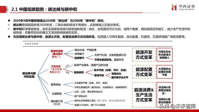 2020年9月中国明确提出2030年“碳达峰”与2060年“碳中和”目标。 碳达峰是指我国承诺2030年前,二氧化碳的排放不再增长,达到峰值之后逐步降低。 碳中和即净零碳排放,旨在实现碳吸收端与排放端的抵消;由此,实现路径可分为加、减两个维度,增加碳固定和碳汇,减少生产生活中的 碳排放,而最终目标的确立又深刻影响脱碳的实现 。 为实现碳达峰与碳中和,能源从开发、配置到消费方式均将改变。包括接入可再生能源,优化配置,在建筑、交通领域推广绿色消费等。(报告来源:未来智库)