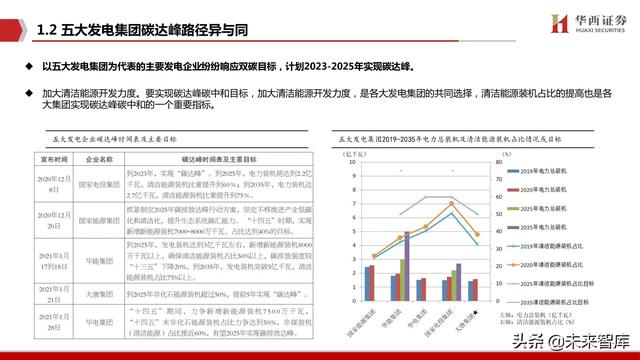 五大发电集团碳达峰路径异与同:以五大发电集团为代表的主要发电企业纷纷响应双碳目标,计划2023-2025年实现碳达峰。 加大清洁能源开发力度。要实现碳达峰碳中和目标,加大清洁能源开发力度,是各大发电集团的共同选择,清洁能源装机占比的提高也是各 大集团实现碳达峰碳中和的一个重要指标。