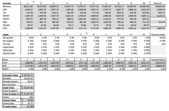 公司的资本支出包括收购以及第五年的一次性29亿美元的收购资本支出,以此反映反映西斯科对Brakes Group的大型收购计划(第五年是否完成对该公司的收购仅为个人猜测,但至少必须包含此收购费用才能与预期增长率一致)。