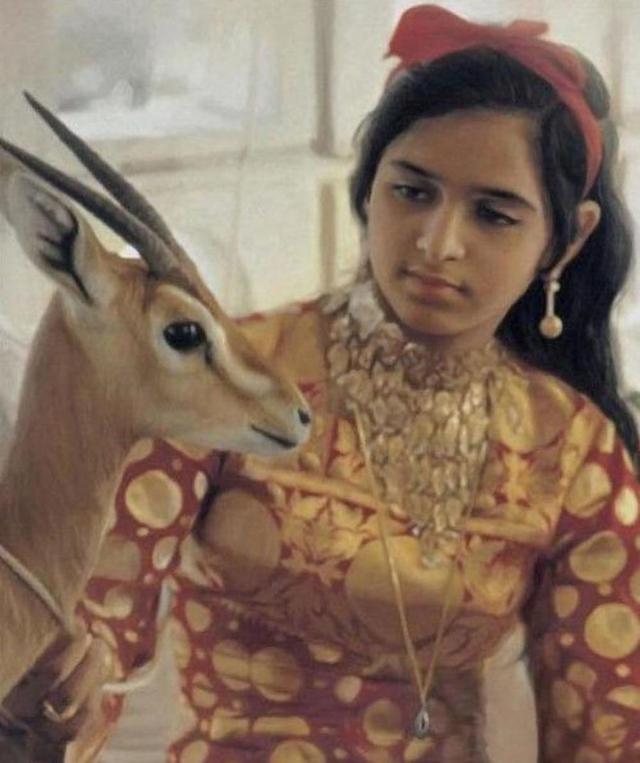 在其中一张旧照上,女主角显然还处在稚气未脱的年龄,她正抚摸着一只羚羊——温顺无害的动物与温顺无害的女性出现在同一个画面中,冥冥中似乎有某种命中注定的味道。