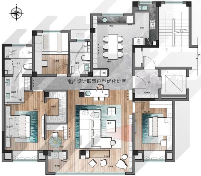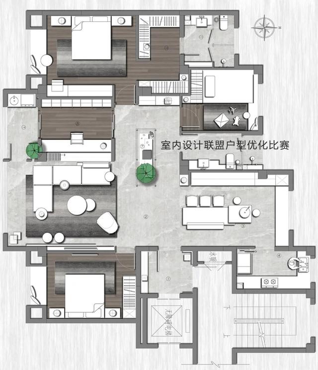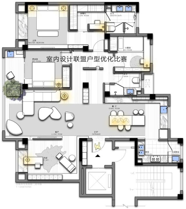 如果没记错的话,这是唯一一个做了3个卫生间的方案,试图用加强功能配套及面积配比来弥补北面卧室,其实还挺舒服的,可以把小孩房的卫生间稍微再调大一点会舒服些,整体空间感挺好的,功能关系也到位了,可以加强一下细节处理,图面表达看着不是太舒服。