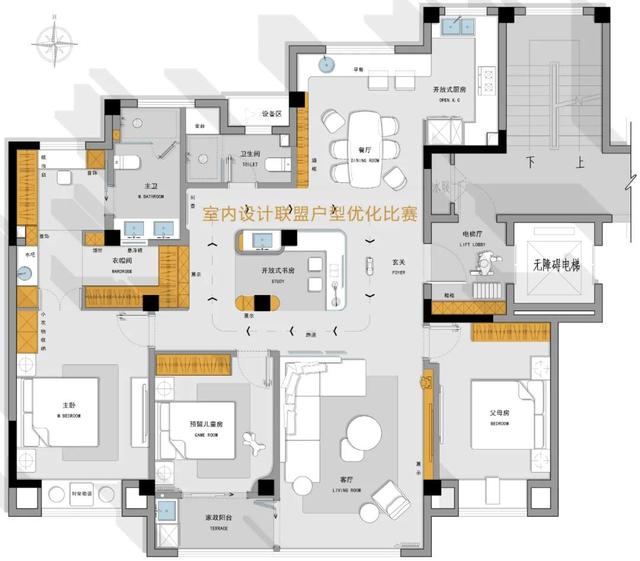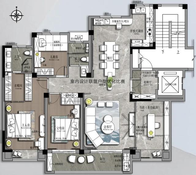 1.大平层空间的设计,视线的开阔程度是非常重要的;房间要做的开阔,首先得满足合适的空间改造(比如墙体的拆建);大多数选手,纠结墙体要什么去突破变化,这很容易带出一定“符号”特征;但是,这位选手用开放式的书房+小孩的玩耍互动(这是两种不同的【变量】成年人+小孩;(也可以理解1+1=1)好的案子和业主的生活方式是一致的。