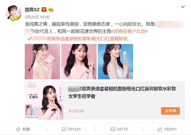在3月24号这一天呢,郑爽在自己的微博中发布了新的动态,官宣了自己成为了某个美妆品牌的代言人呢,原来在最近郑爽是接下了个美妆产品的新代言呀,爽妹子果真是优秀呢!这次亲自代言彩妆产品,也太令人惊喜了吧。